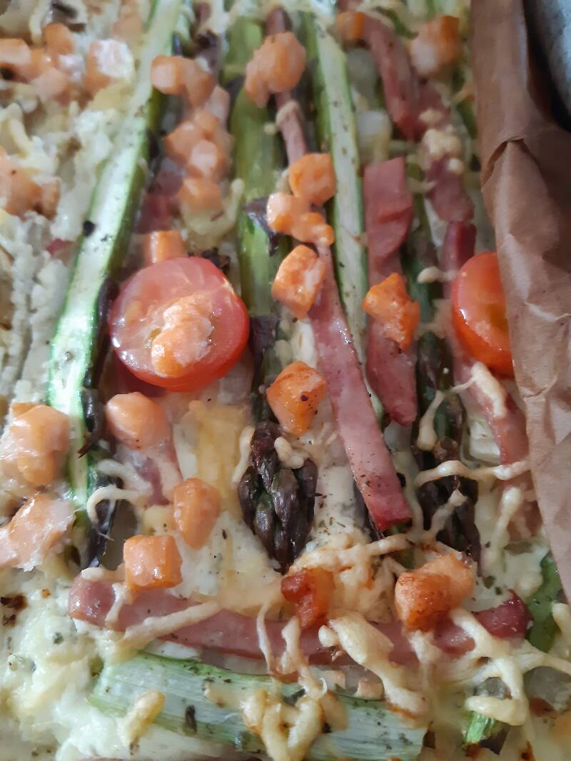 flammkuchendeeg, roomkaas, 1 ui, zalmblokjes (en/of ham), cherrytomaatjes, italiaanse kruiden, peper en zout (zeezout), verse groene asperges, wat kaas